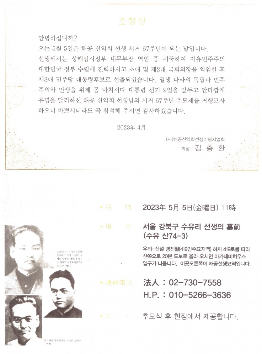해공 신익희 선생님의 서거67주년 추모깃을 거행코자 하오니 바쁘시드라도 꼭 참석해 주시면