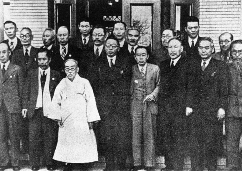후열 : 왼편으로부터 일파 엄항섭, 황학수, 성주식, 김성숙, 김상덕, 단주 유림, 백강 조경한, 김봉준, 유동열